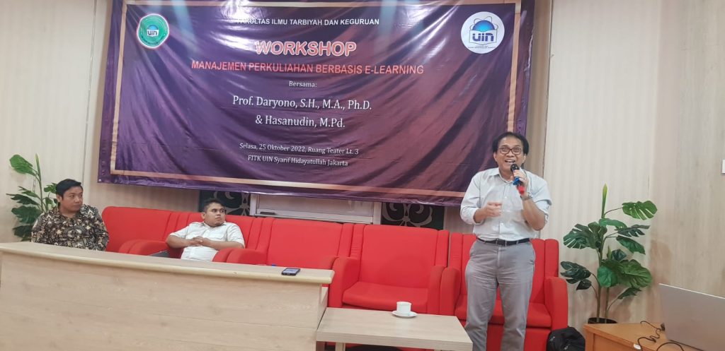 Untuk mengupas persoalan di atas, Fakultas Ilmu Tarbiyah dan Keguruan (FITK) UIN Jakarta kembali menyelenggarakan Workshop bertajuk “Manajemen Perkuliahan Berbasis E-Learning bagi Dosen Batch 2”. Pada batch 1, FITK menghadirkan dua dosen muda Tadris Fisika, Dzikri Rahmat Romadhon, M.PFis., dan Ahmad Suryadi, M.Pd. Sementara pada batch 2, FITK menghadirkan Prof. Daryono, S.H., M.A., Ph.D., (Kapus Riset dan Inovasi Pendidikan Terbuka dan Jarak Jauh Universitas Terbuka) dan Hasanudin, M.Pd. (Dosen-Tenaga Kependidikan FITK)