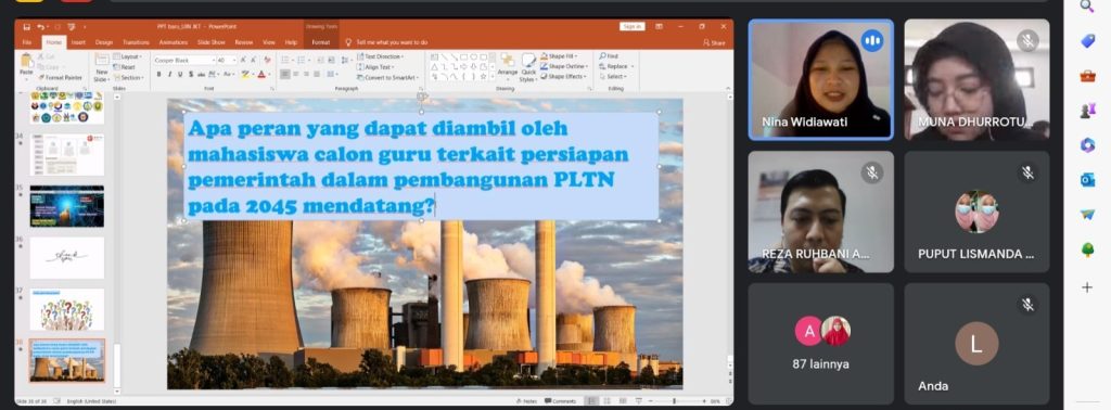 Acara dimulai dengan sambutan pembukaan dari Dosen Mata Kuliah Fisika Nuklir Program Studi Tadris Fisika yaitu Reza Ruhbani Amarulloh, M.Pd., yang menjelaskan pentingnya pemahaman tentang karir dan peluang di bidang fisika nuklir bagi para mahasiswa. Selanjutnya, Dr. Nina Widiawati, M.Pd., memberikan presentasi yang informatif dan menginspirasi tentang perkembangan terkini dalam fisika nuklir, proyek-proyek yang sedang berjalan, dan potensi karir yang menarik dalam bidang tersebut.