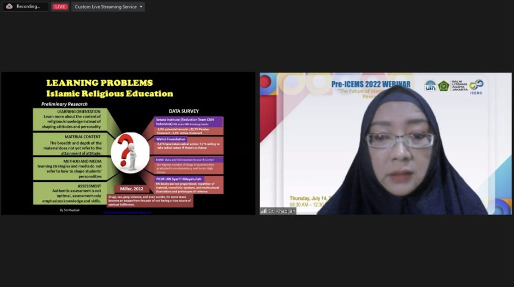 Terkait dengan pendidikan Islam, Dr. Siti Khadijah, M.A., narasumber webinar menuturkan bahwa berdasarkan hasil survei Setara Institute, Wahid Institute, BNNRI wajah pendidikan Indonesia dihantui dengan penggunaan narkoba, masalah sikap intoleransi, potensi melakukan aksi radikal dan terorisme di kalangan siswa dasar sampai menengah atas. Hal ini, pun diperburuk dengan temuan PKIM UIN Syarif Hidayatullah bahwa buku ajar pendidikan agama Islam tidak proporsional, repetisi materi, opini yang monolitik, dengan ilustrasi yang tidak multikultur dan contoh prototipe kekerasan.