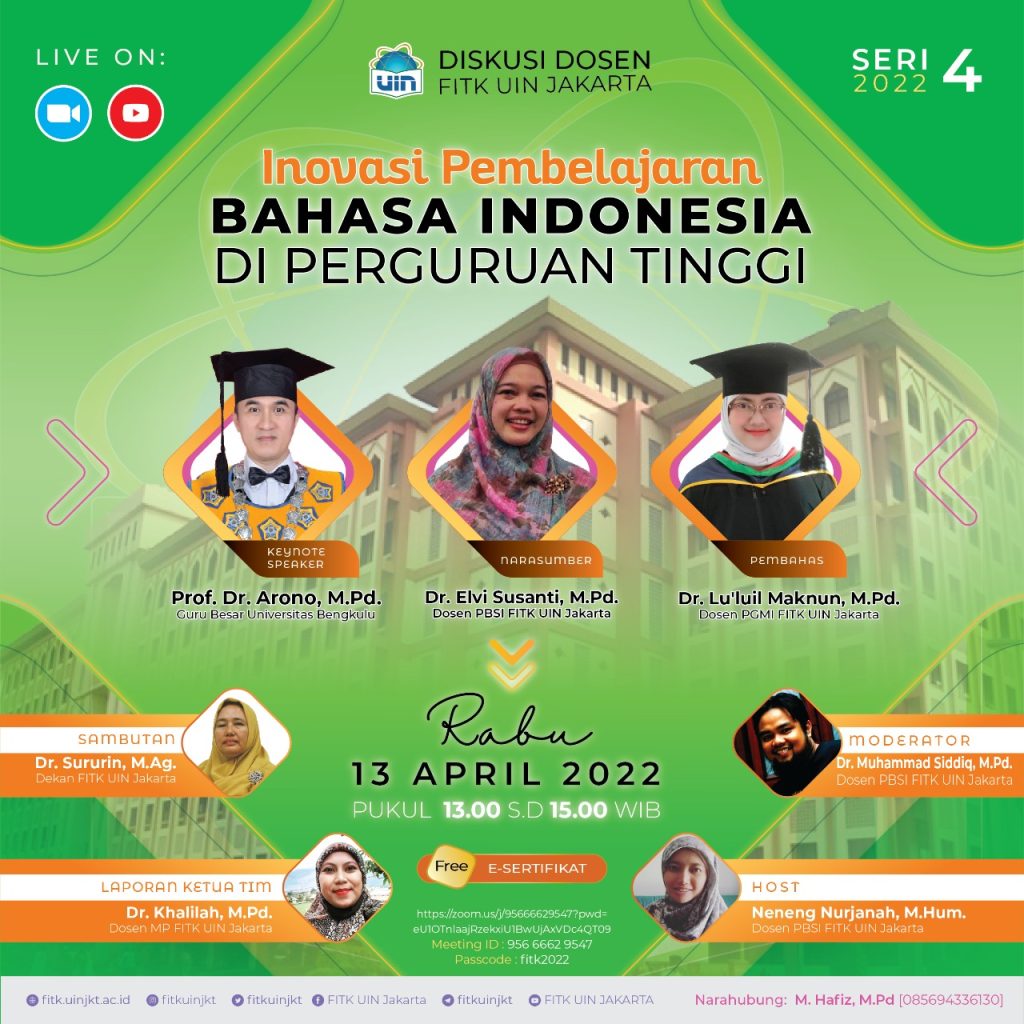 ποΈ Keynote Speaker Prof. Dr. Arono, M.Pd. (Guru Besar Universitas Bengkulu) ποΈ Narasumber Dr. Elvi Susanti, M.Pd. (Dosen PBSI FITK UIN Jakarta) ποΈPembahas : Dr. Lu'luil Maknun, M.Pd. (Dosen PGMI FITK UIN Jakarta) ποΈModerator : Dr. Muhammad Siddiq, M.Pd (Dosen PBSI FITK UIN Jakarta βββββββ