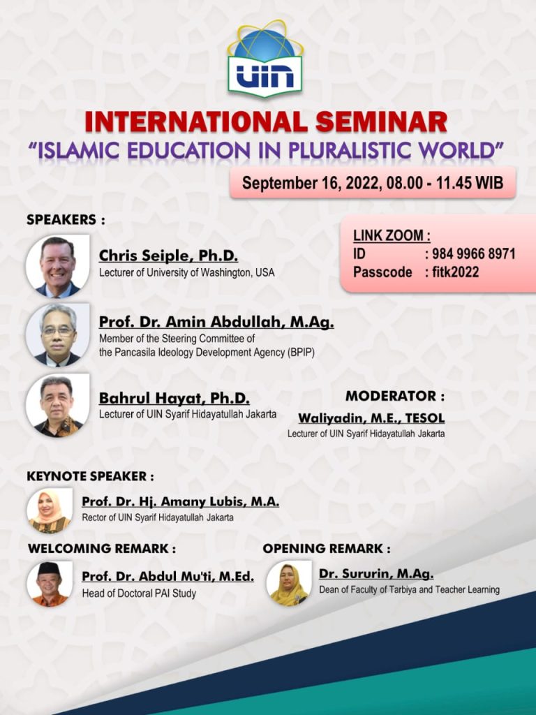 Seminar Internasional tersebut akan diisi oleh 3 narasumber, yaitu Chris Seiple, Ph.D., (University of Washington, USA), Prof. Dr. Amin Abdullah, M.Ag. (Anggota Dewan Pengarah Badan Pembinaan Ideologi Pancasila), dan Bahrul Hayat, Ph.D. (UIN Syarif Hidayatullah Jakarta).